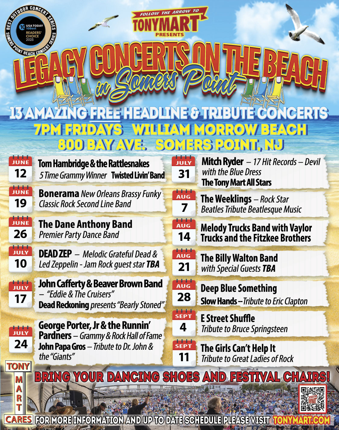 LEGACY CONCERTS ON THE BEACH IN SOMERS POINT Voted #1 outdoor concert venue by USA Today readers poll in 2023 & 2025! Check out this amazing and incredibly free, diverse lineup of the very best classics, Americana, funk, roots rock and jammin’ R&B together with the very best tribute bands and multi selling Grammy award winning recording artists, performing 13 Friday night free shows from June 12th to Sept 11th. In 2023 & 2025 we were voted best in the country; in 2024 we were in the top two. Click on the link below to see the full schedule of international stars and some of the hottest emerging bands!